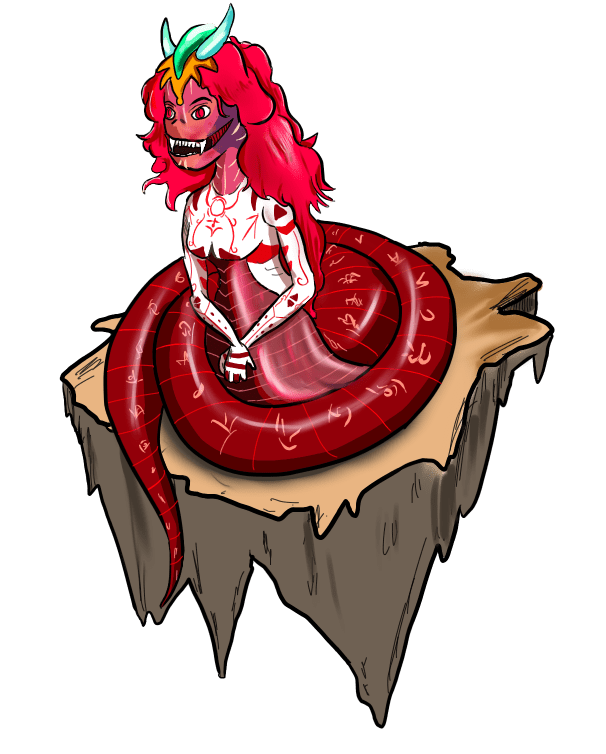 Request: u/Consistent_Bar_8963; site reddit Can someone draw me a female lamia oc? – Candy apple red hair, red scales white inner body, wearing a white top with red embroidery. She should be smiling and coiled up like a corkscrew